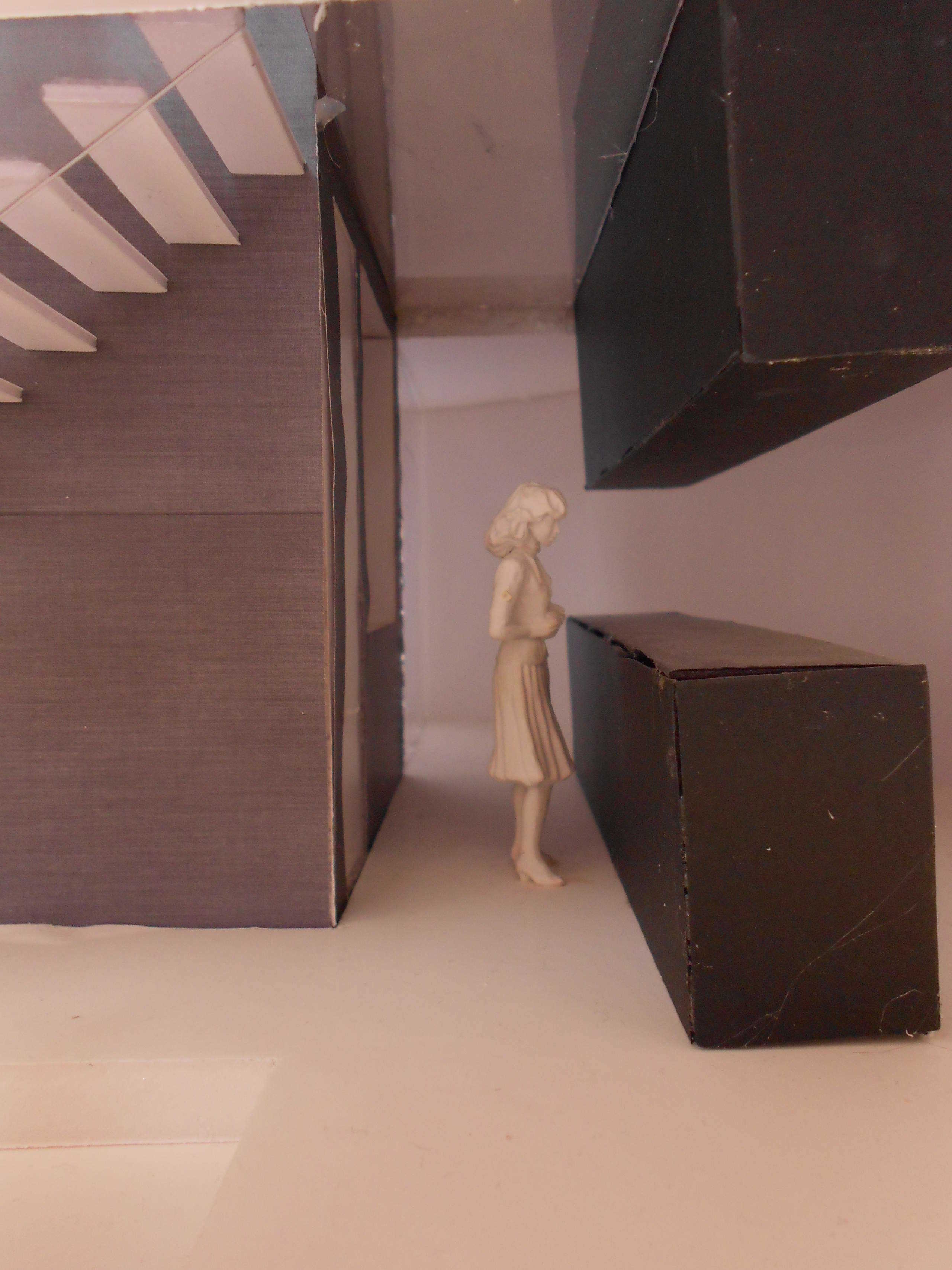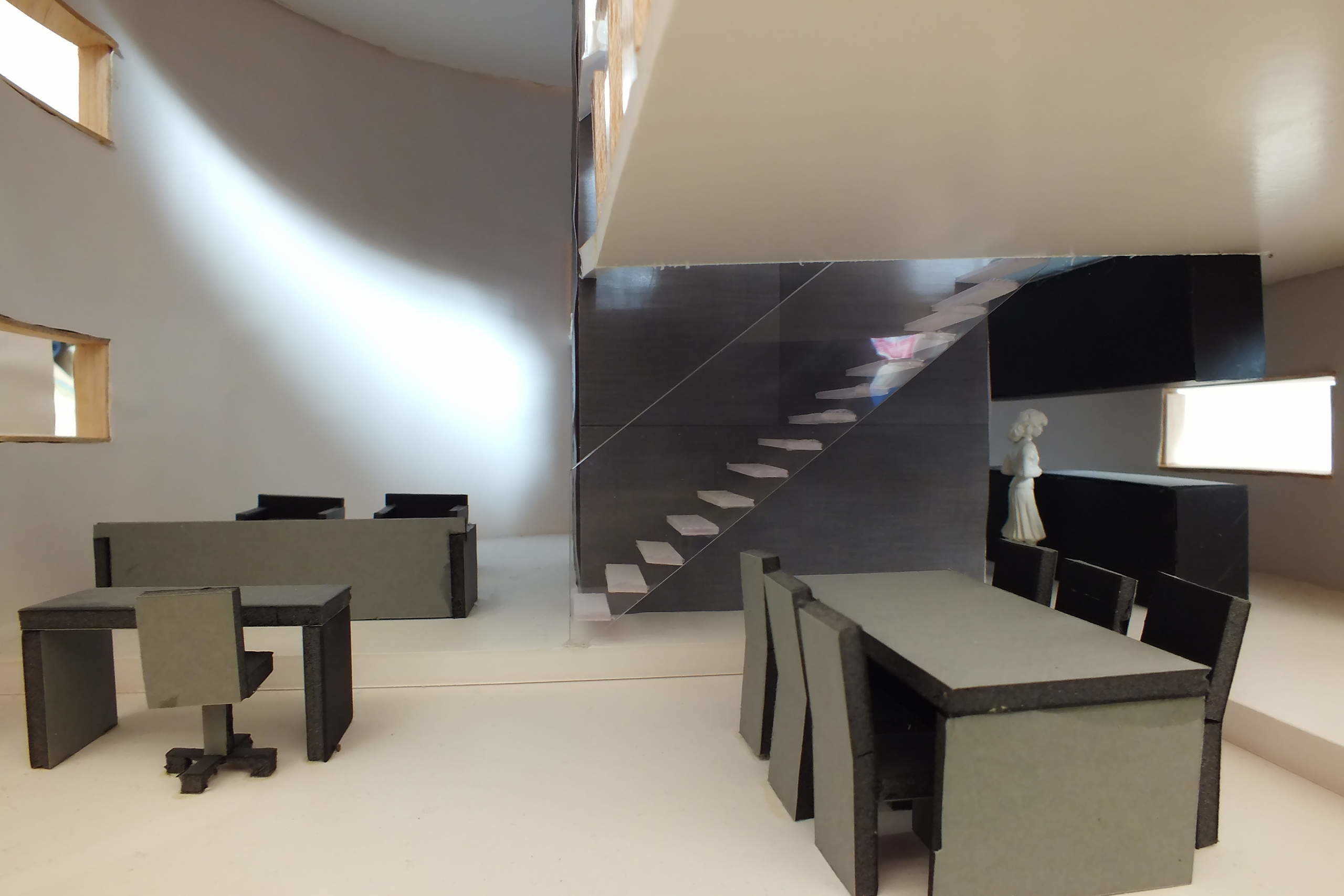 In de inkomhal bevinden zich twee glazen deuren: één naar de keuken, om boodschappen rechtstreeks naar daar te brengen, en één naar de zitruimte. Boven de zitruimte is er een grote vide voorzien zodat je vanaf de eerste verdieping naar beneden kan kijken. Bij de bovenkant van de trap is er glas voorzien in de vloer voor diezelfde reden. De module van de keuken wordt doorgetrokken tot de eerste verdieping waar dan de kleedfunctie in verwerkt zit voor een visueel geheel.